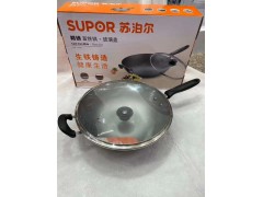 蘇泊爾精鑄鐵炒鍋,兩個款式可立蓋款,過的尺寸為30cm,銀白色款有涂層,尺寸為32cm。